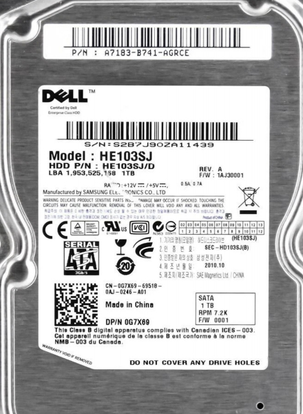 Жесткий диск Dell G7X69 1Tb SATAII 3,5" HDD
